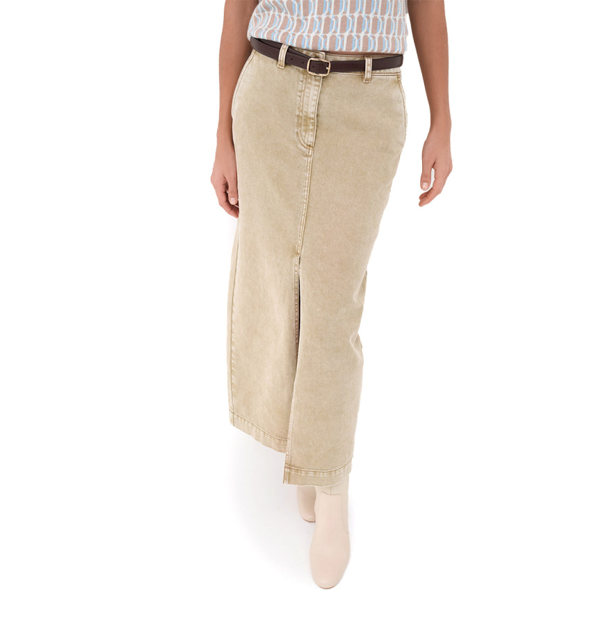 Джинсовая юбка-миди актуального бежевого оттенка из неплотного денима. Модель прямого силуэта с принтом и шлицей спереди.