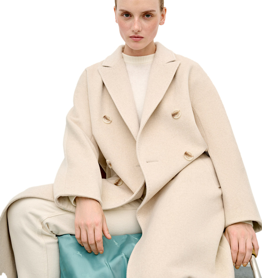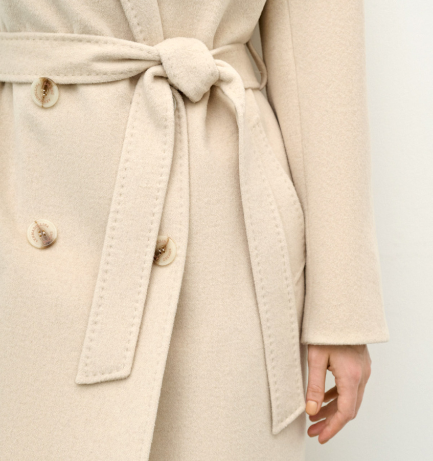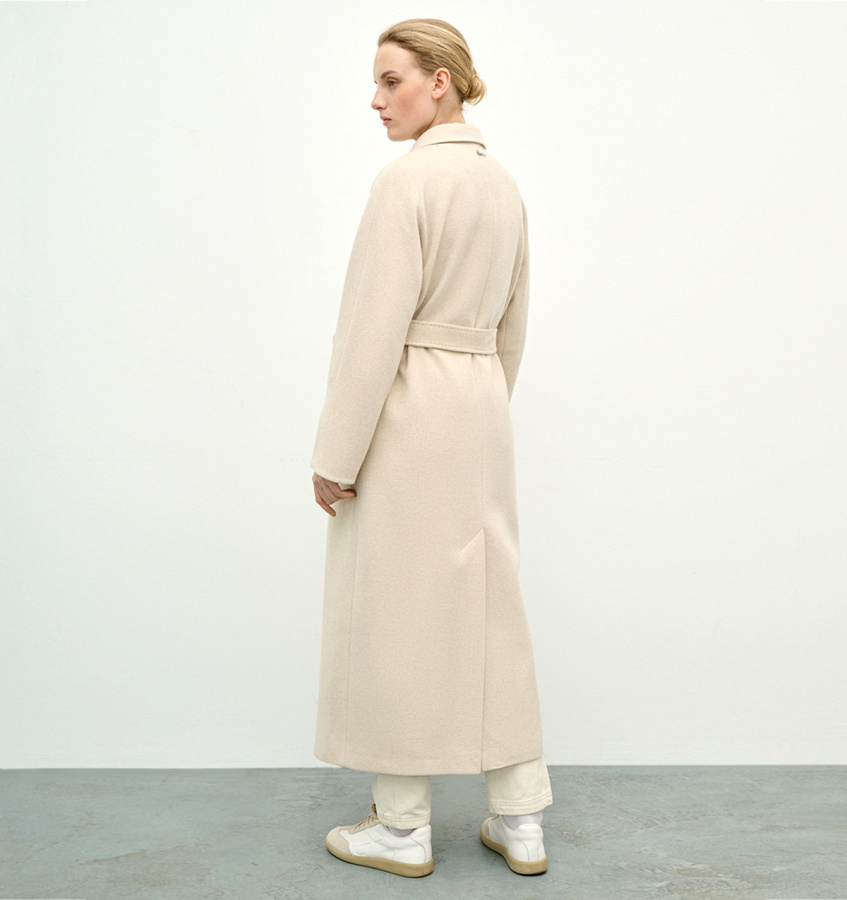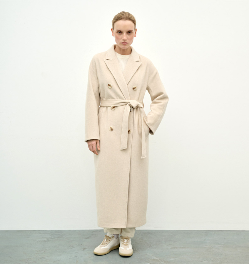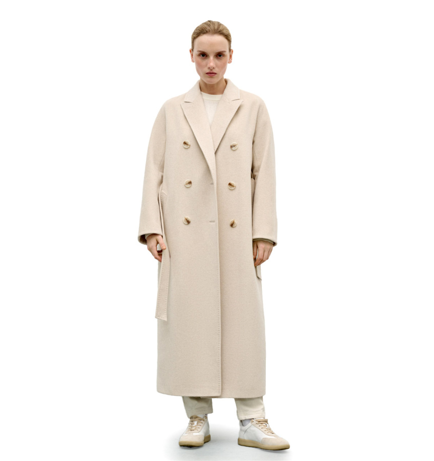 Двубортное шерстяное пальто в классическом стиле. Сдержанная модель длиной миди с английским воротником, двубортной застежкой на пуговицы и прорезными карманами.