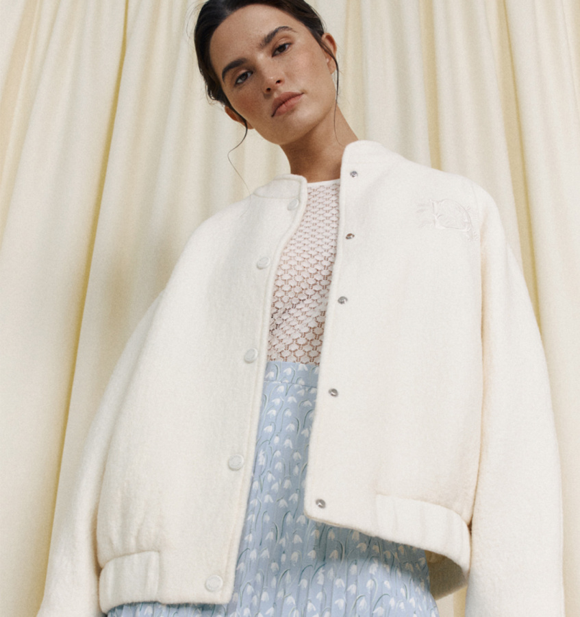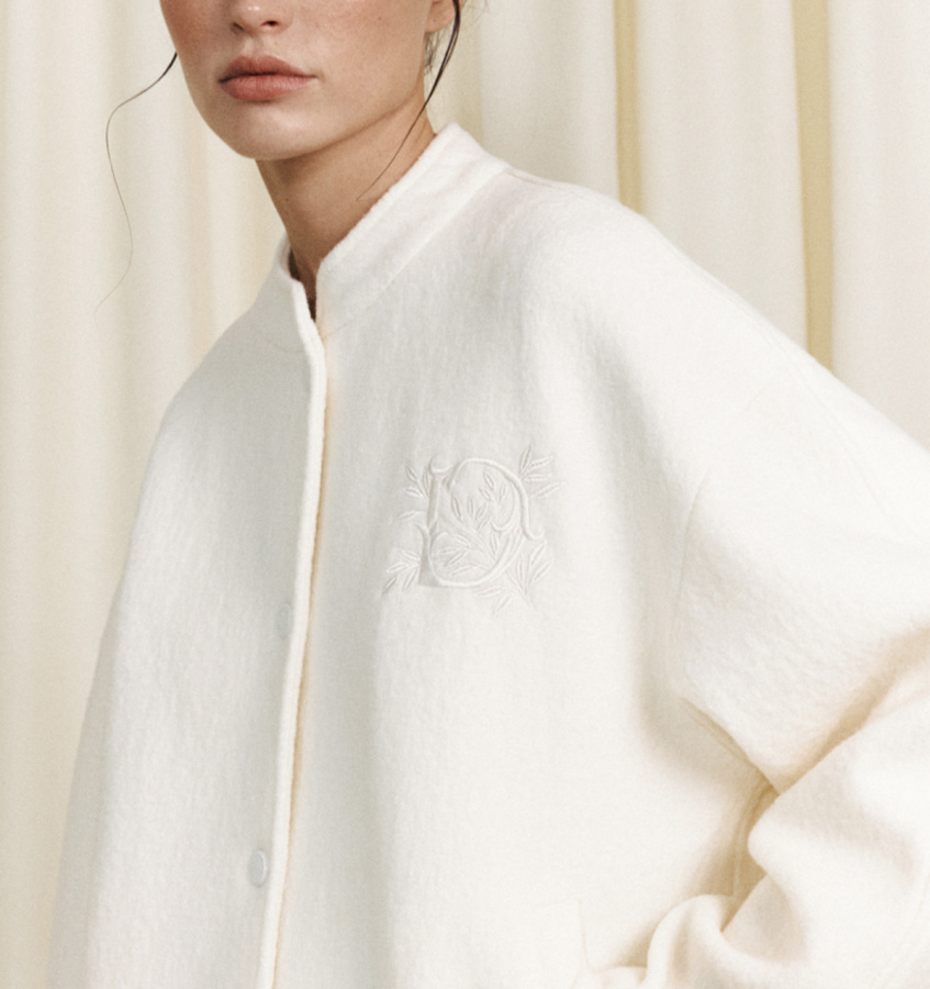 Стильный шерстяной бомбер с фирменной вышивкой бренда. Модель силуэта оверсайз с воротником-стойкой, прорезными карманами и застежкой на кнопки.
