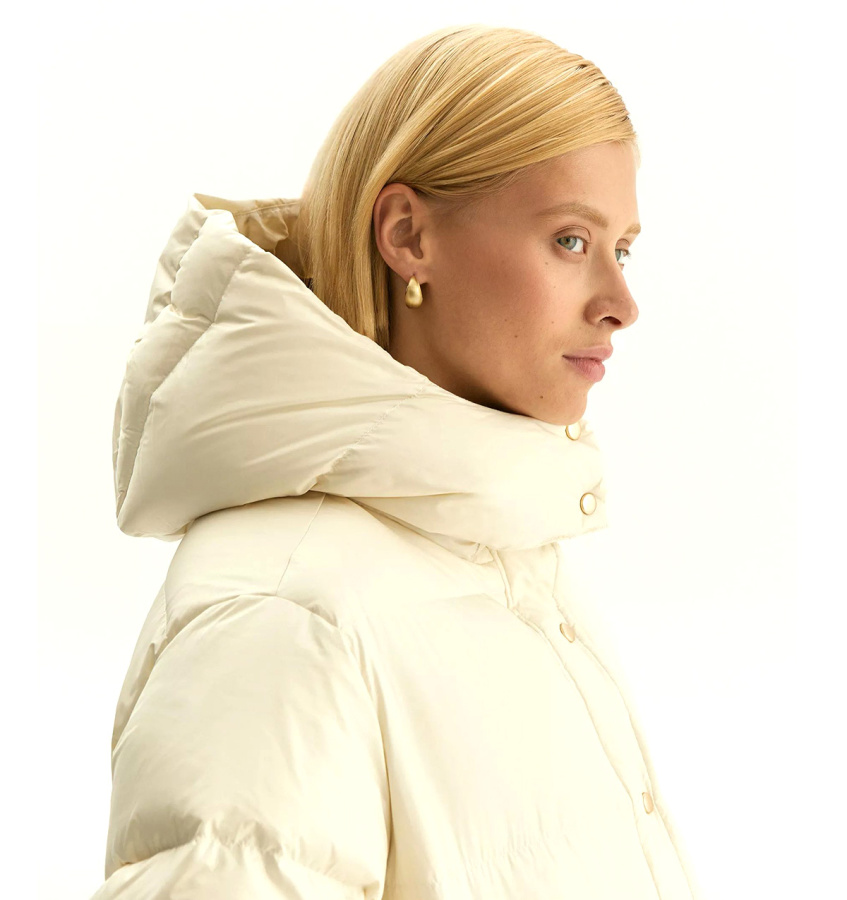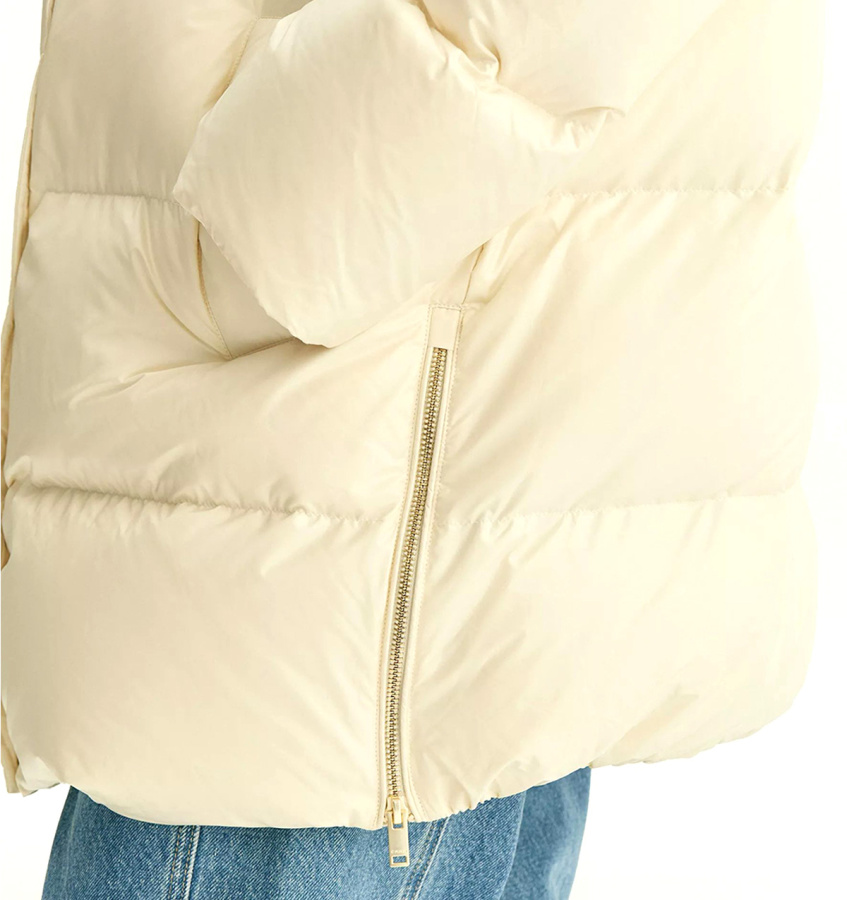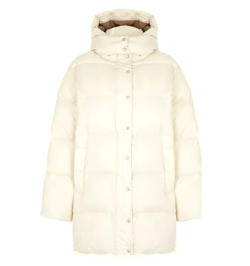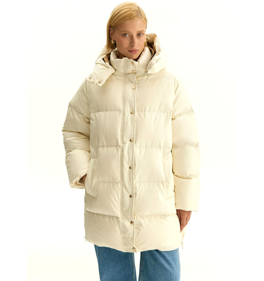 Пуховик Emka в дорогом и элегантном жемчужном оттенке для самых стильных зим. Золотистая фурнитура и контрастная подкладка карамельного цвета делают образ дороже.