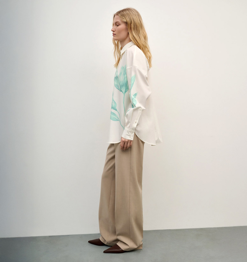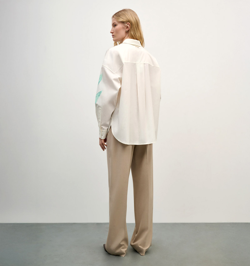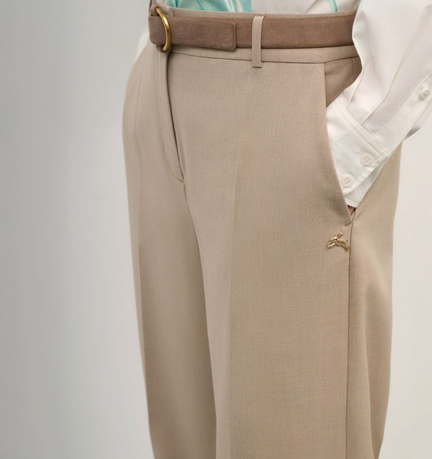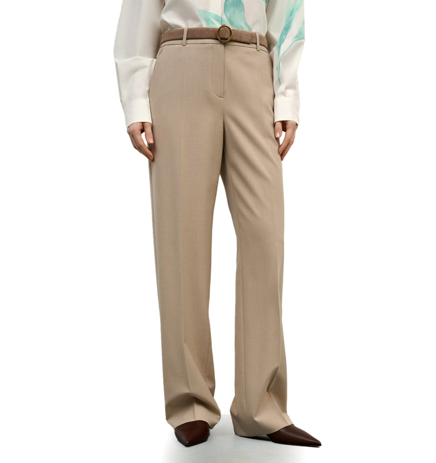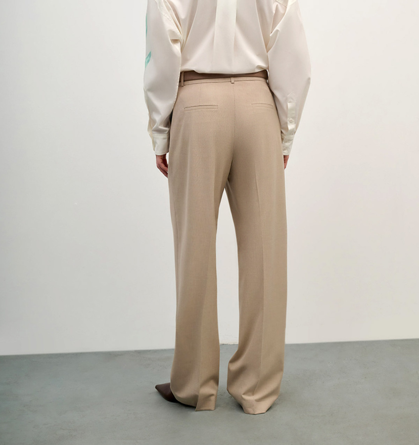 Классические брюки бежевого оттенка послужат парой в дополнение к жакету из коллекции бренда. Модель лаконичного прямого кроя с аккуратными стрелками и прорезными карманами.