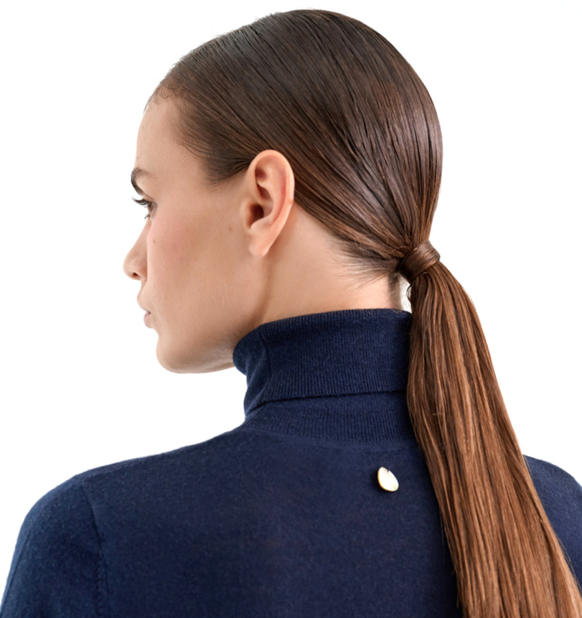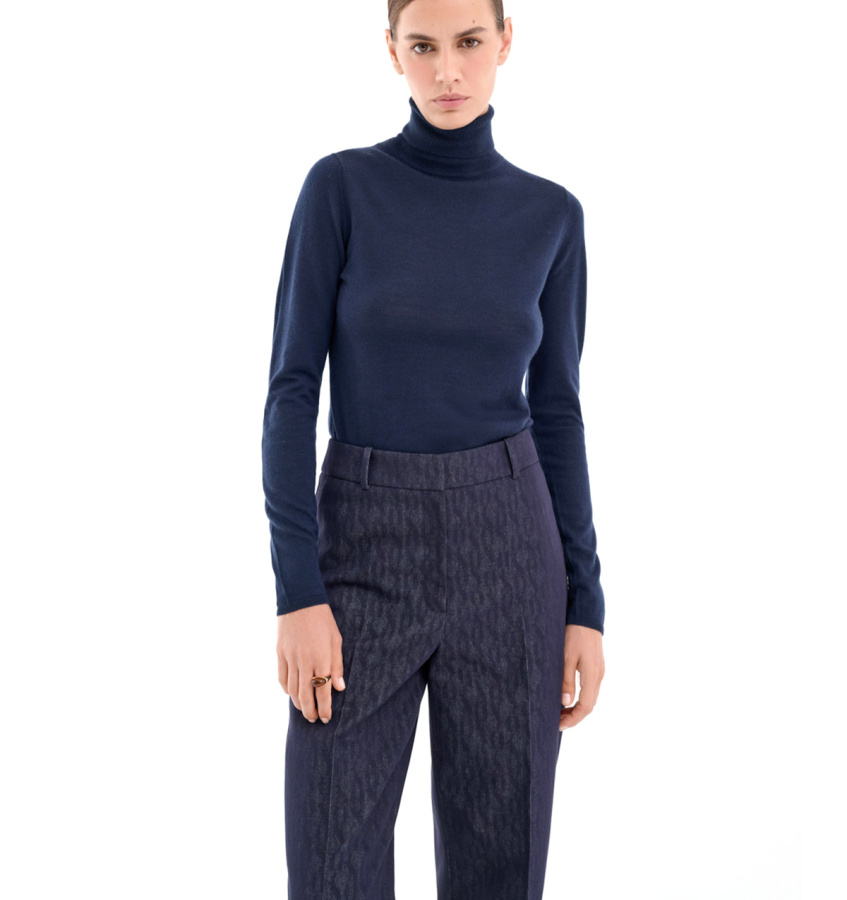 Джемпер синего оттенка выполнен из 100% мериносовой шерсти. Базовая модель облегающего силуэта с воротником-стойкой.