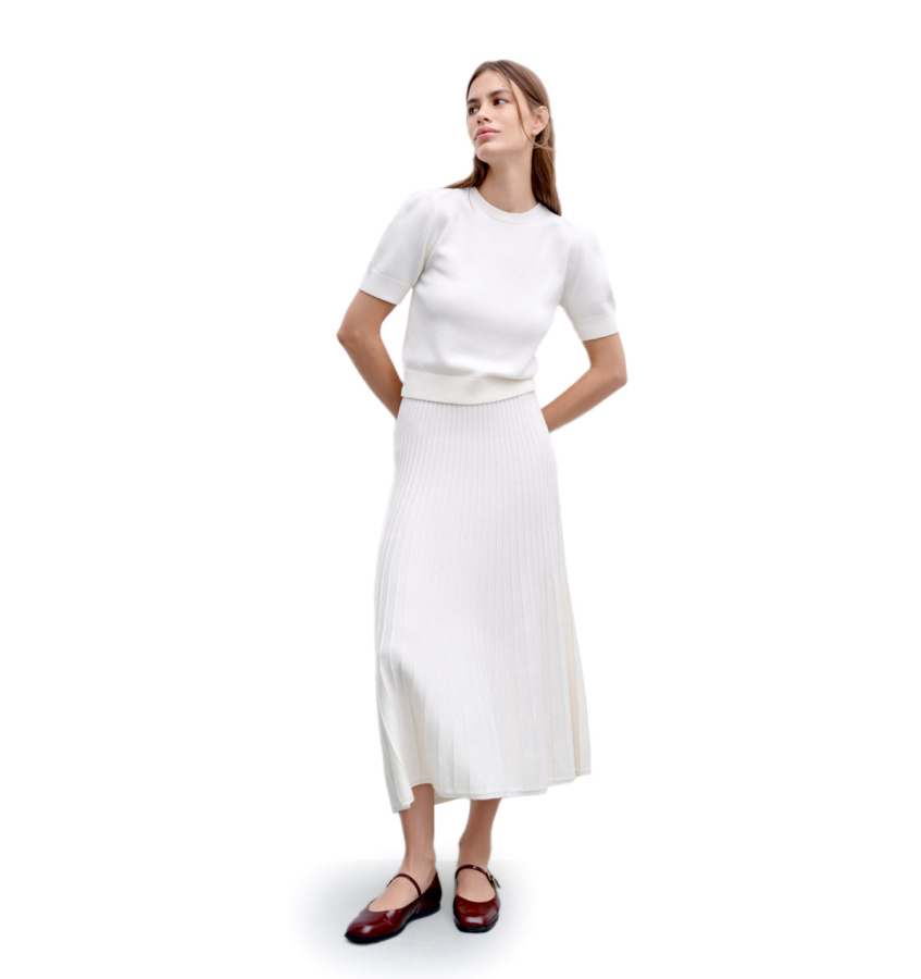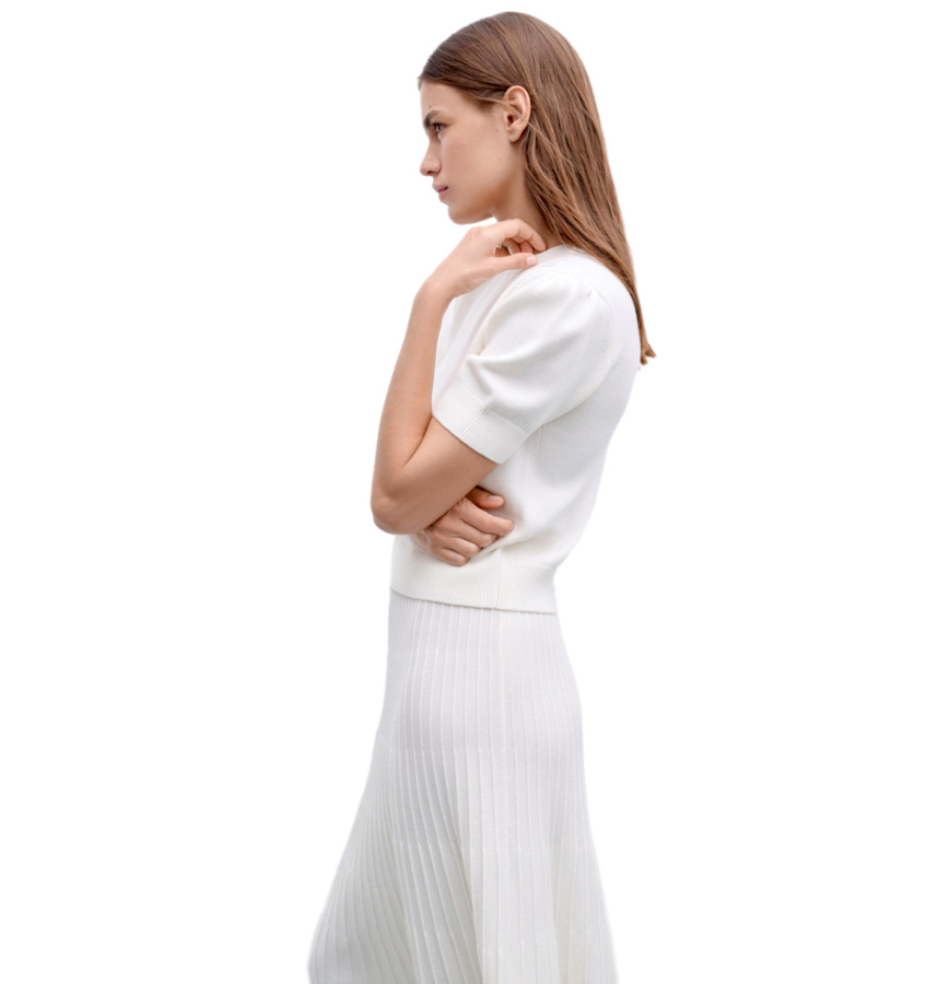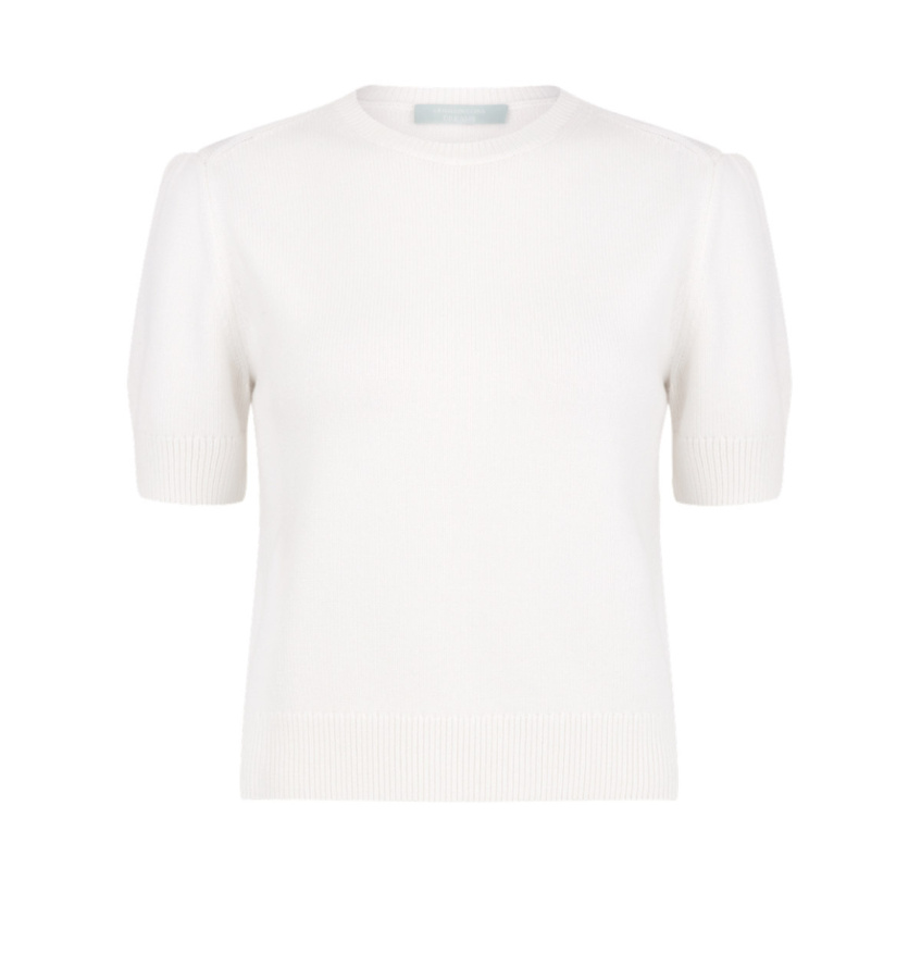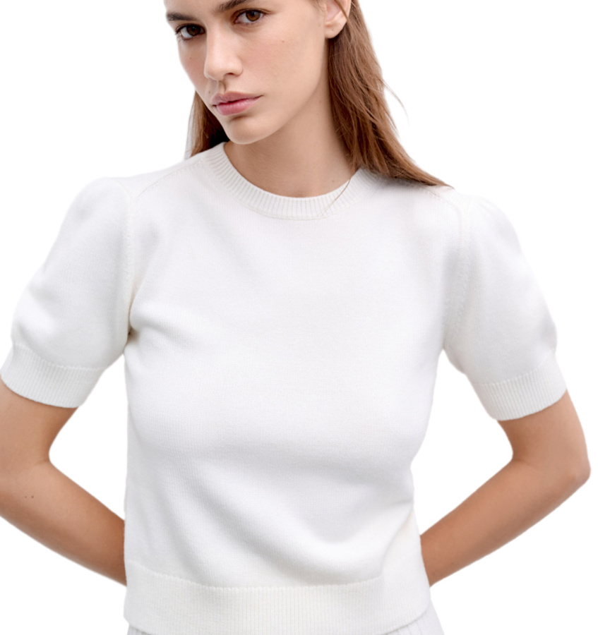 Женственный джемпер молочного оттенка. Модель прямого кроя с укороченными рукавами выполнена из тонкой мериносовой шерсти и вискозы.