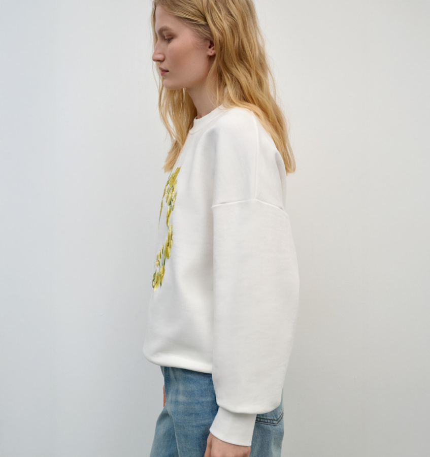 Уютная толстовка из мягкого хлопка с авторским принтом – универсальный предмет повседневного гардероба. Модель прямого силуэта с классическим круглым вырезом, плотными манжетами и уплотненной вставкой по низу.